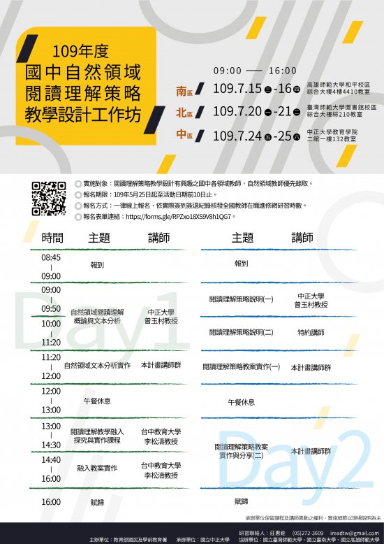三、 檢附 109 年暑期閱讀相關研習資訊表、「109 年度國中自然領域閱讀理解策略教學設計工作坊」修正版宣傳海報、「109 年度課文本位閱讀理解策略教學-進階工作坊(花蓮場)」宣傳海報、「109 年度國中國文科閱讀理解策略教學工作坊」宣傳海報各 1 份。