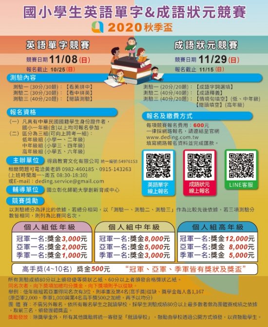 三、活動日期:英語單字競賽 109 年 11 月 8 日(星期日)、成語狀元競賽 109 年 11 月 29 日(星期日)。