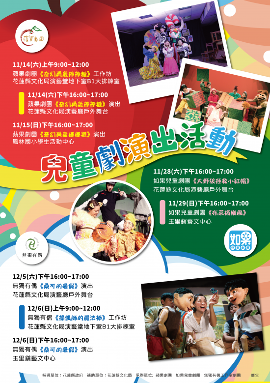 (一)場次 1 : 109 年 11 月 28 日(週六)下午 4 時假花蓮縣文化局演藝堂戶外舞台、演出單位:如果兒童劇團《大野狼拯救小紅帽》。