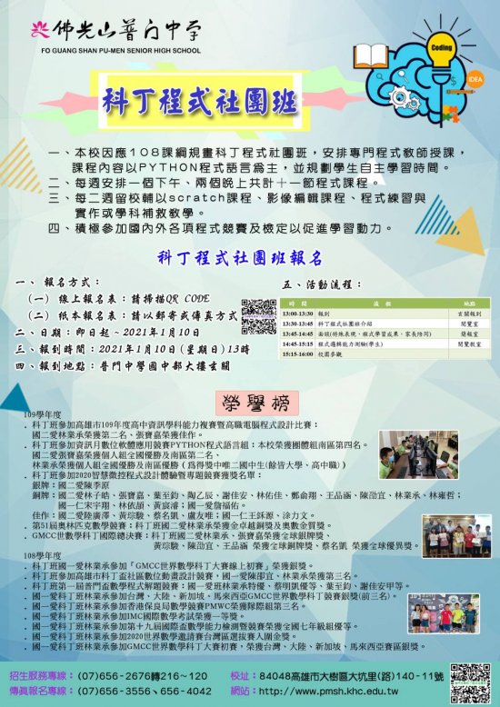一、為推動程式教育與科丁聯盟合作,開設國中程式社團班成效斐然,榮獲高雄市資訊學科能力競賽國中組第二名、 GMCC 世界數學科丁大賽全球銀獎等多項殊榮。