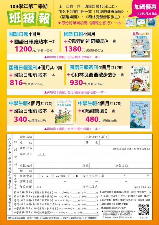 一、 本社即日起推出「109-2 學期班級報」優惠訂閱專案,此案訂閱期間為 4 個月。