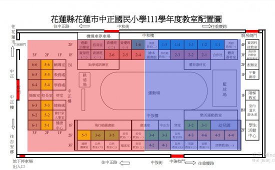 1.紅色區塊班級疏散至中正門廣場,藍色區塊班級疏散至籃球場。