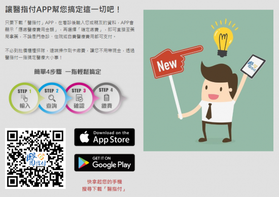三、為縮短等候櫃台批價時間,可使用醫指付 APP 及自助繳費機等繳費方式。