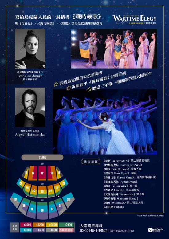 (三)表演介紹:烏克蘭聯合芭蕾舞團( United Ukrainian Ballet )集結一群烏克蘭頂尖芭蕾舞者,他們來自於烏克蘭各地劇院與舞團,因烏俄戰爭而流離失所,最後落腳荷蘭海牙,在此重拾舞鞋,恢復日常的訓練,組成一 支職業舞團,在此作為烏克蘭芭蕾舞者的戰時庇護所。 2022 年烏克蘭聯合芭蕾舞團陸續巡演英國、澳洲、新加坡、美國等地,所到之處票券銷售一空,感動無數觀眾,讓世人見證藝術撫慰人心的神奇力量。本次舞團將帶來《戰時輓歌》、《吉賽兒》、《唐吉軻德》、《舞姬》等最受歡迎的舞劇選粹。《戰時輓歌 Wartime Elegy 》是當代最重要的編舞家之一拉特曼斯基 ( Alexei Ratmansky )在烏俄戰爭爆發後的全新創作, 但並未充滿政治訊息,相反地,他採用了烏克蘭當代最知名作曲家西爾維斯特洛夫( Valentin Silvestrov )的音樂,加上烏克蘭傳統歌曲,是拉特曼斯基寫給烏克蘭人民的一封情書,向他們堅韌不拔的精神致敬,並祈禱 未來的和平。其他精采節目包括《舞姬 La Bayadere 》充滿動感與異國風情的第二幕;以雙手關節展現不可思議靈活度與生命力的《垂死的天鵝 The Dying Swan 》;挑戰男女舞者技巧極限的《海盜 Le Corsaire 》第一幕; 以及《唐吉軻德 Don Quixote 》的大雙人舞等,其 32 鞭轉的難度完全不遜於黑天鵝在《天鵝湖》的高潮。此外,舞團更特邀世界其他頂尖舞團的烏克蘭舞星,包括前馬林斯基首席 Anastasia Matvienko 與 Denis Matvienko , 以及英國國家芭蕾的 Katya Khaniukova 等人加入客席陣容,為台灣民眾帶來一場最精采的芭蕾盛宴,希望以藝術感動人心,為這個紛擾的世界帶來光明與希望。