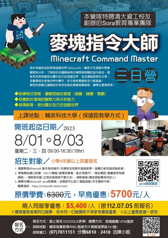 二、小學 4 年級以上孩童報名,需要熟悉 Minecraft 基本角色操作(本課程沒有額外基礎教學,推薦已參加過初階班者)。