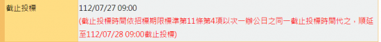 因颱風等天災停止上班,截止投標日依「招標期限標準」第 11 條第 4 項規定,截止投標日或截止收件日為辦公日,而該日因故停止辦公致未達原定截止投標或收件時間者,以其次一辦公日之同一截止投標或收件時間代之。本校原訂 112 年 7 月 27 日(星期四)上午 9:00 截止投標之採購案順延至 112 年 7 月 28 日(星期五)上午 09:00 截止投標。開標時間將個別通知各投標廠商。