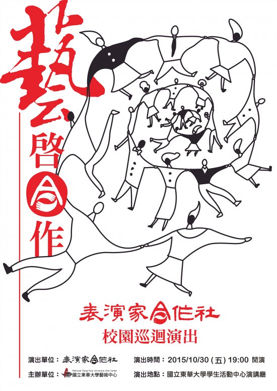 一、「幸福總鋪師」演出資訊如下: (一)演出時間: 2015 年 10 月 29 日(四)19 時 00 分 (二)演出地點:東華大學學生活動中心演講廳 二、「藝啟合作」演出資訊如下: (一)演出時間: 2015 年 10 月 30 日(五)19 時 00 分 (二)演出地點:東華大學學生活動中心演講廳 三、以上活動不需報名、免費入場,歡迎自由入座。