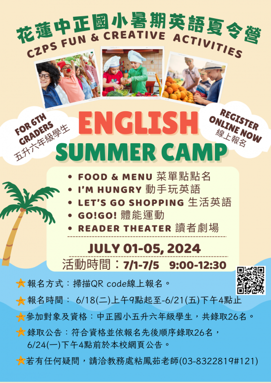 自動產生的描述五、參加對象及資格:中正國小五升六年級對英文有興趣、樂於表達的學生,共錄取 26 名,依報名先後順序錄取。