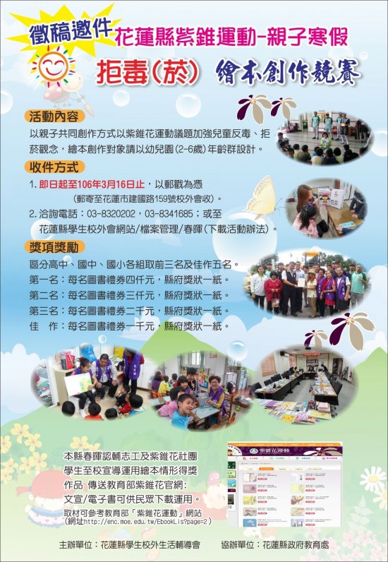 花蓮縣學生校外生活輔導會辦理106年度「紫錐運動-親子寒假拒毒(菸)繪本創作競賽」歡迎親子踴躍參加