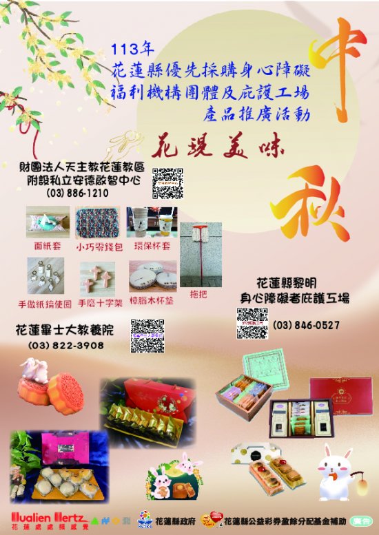 花蓮縣身心障礙福利機構團體及庇護工場所生產之秋節產品,參考選購。