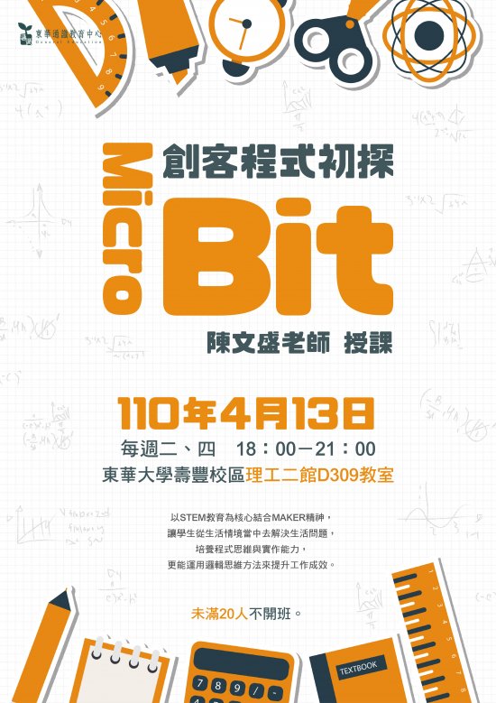 一、通識教育中心開辦「MicroBit 創客程式初探」等八門實體課程及「易經:指引你生命的明燈」一門線上課程,共計九門,請惠予轉知貴校教職員生與家長,並鼓勵踴躍報名。