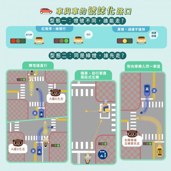 交通事故件數近 6 成發生在路口,未依規定讓車為主要肇因之一,顯示民眾對於路口上不同行向車輛間的用路優先順序關係。