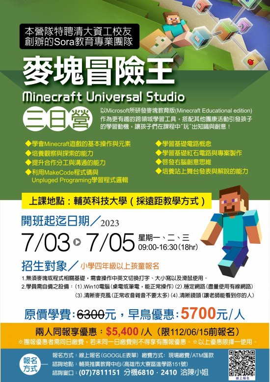 一、課程特色:以 Microsoft 所研發麥塊教育版(Minecraft Educational edition)作為更有趣的跨領域學習工具,搭配其他團康活動引發孩子的學習動機,讓孩子們在課程中『玩』出知識與創意