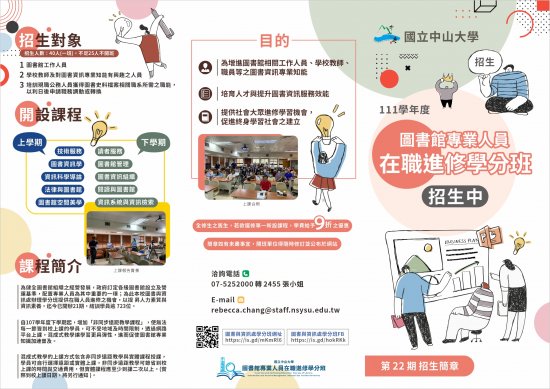 | 主旨: | 函轉國立中山大學圖書與資訊處辦理「第22期圖書館專業人員在職進修學分班」下學期招生簡章,請貴校鼓勵在職人員參加並核予公差假,請查照。 |