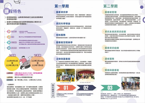 | 三、 | 自107學年度下學期起,增加「非同步遠距教學課程」,使無法每一節皆到校上課的學員,可不受地域及時間限制,透過網路平台上課,混成式教學讓學習更具彈性,進而促使圖書館專業知識加速普及。 |