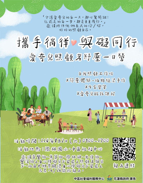 1. 旨案活動為關懷本區身心障礙兒少家庭照顧者,使其獲取喘息機會,學習自我照顧及紓壓的方式,擬於114/8/2辦理「攜手徜徉.與礙同行-愛奇兒照顧者紓壓一日營」,活動內容詳如海報公告。