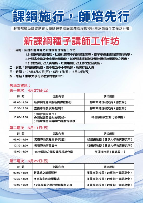 一、研習時間:107年4月27日、5月11日、6月22日。 二、報名請逕至全國教師進修網站報名(課程代碼2401573、2401575、2401576),全程參與者核予研習時數。 三、研習地點:國立東華大學花師教育學院B320(97401 花蓮縣壽豐鄉大學路二段一號)