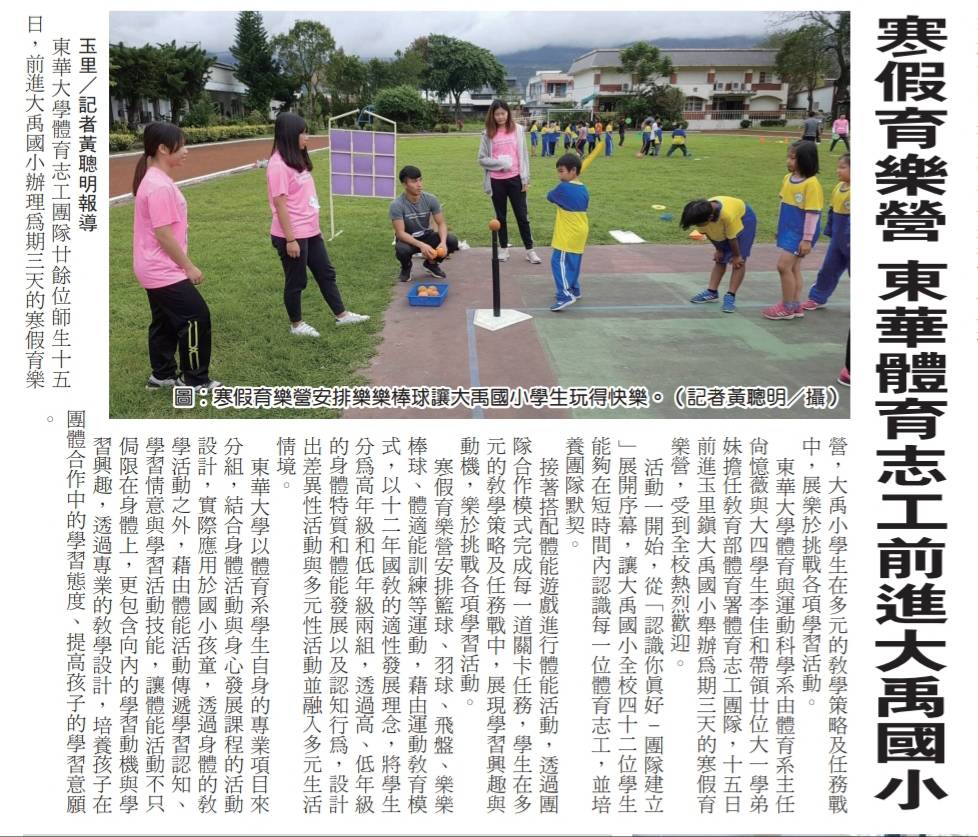 花蓮國立東華大學體育與運動科學系由體育系尚憶薇主任與大四學生李佳和帶領20位大一學弟妹擔任教育部體育署體育志工團隊前進玉里鎮大禹國小舉辦為期三天的寒假育樂營。