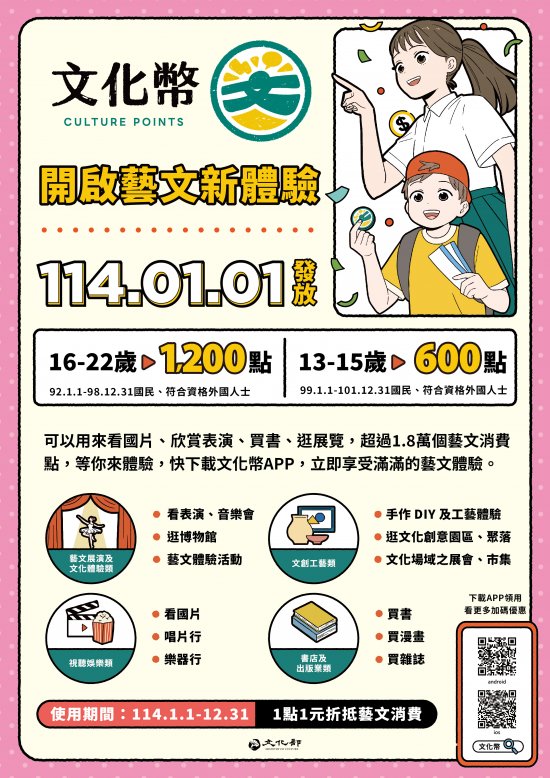二、 為鼓勵青少年參與藝文活動、拓展文化體驗,並促進藝文產業發展,文化部自112年起發放文化禮金,作為觀賞國片、欣賞表演、購書閱讀、參觀博物館及參與手作DIY等藝文消費折抵使用。今(114)年文化禮金持續發放16~22歲每人1,200點文化幣(1點等同新臺幣1元),並同時推廣13-15歲試辦計畫,每人發放600點文化幣,使用期間自114年1月1日至114年12月31日止。。