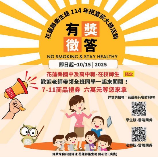 得獎公告:114年10月下旬電腦抽出,中獎名單將於11月上旬公布在花蓮縣衛生局網站與「花蓮縣菸害防制」FB專頁。