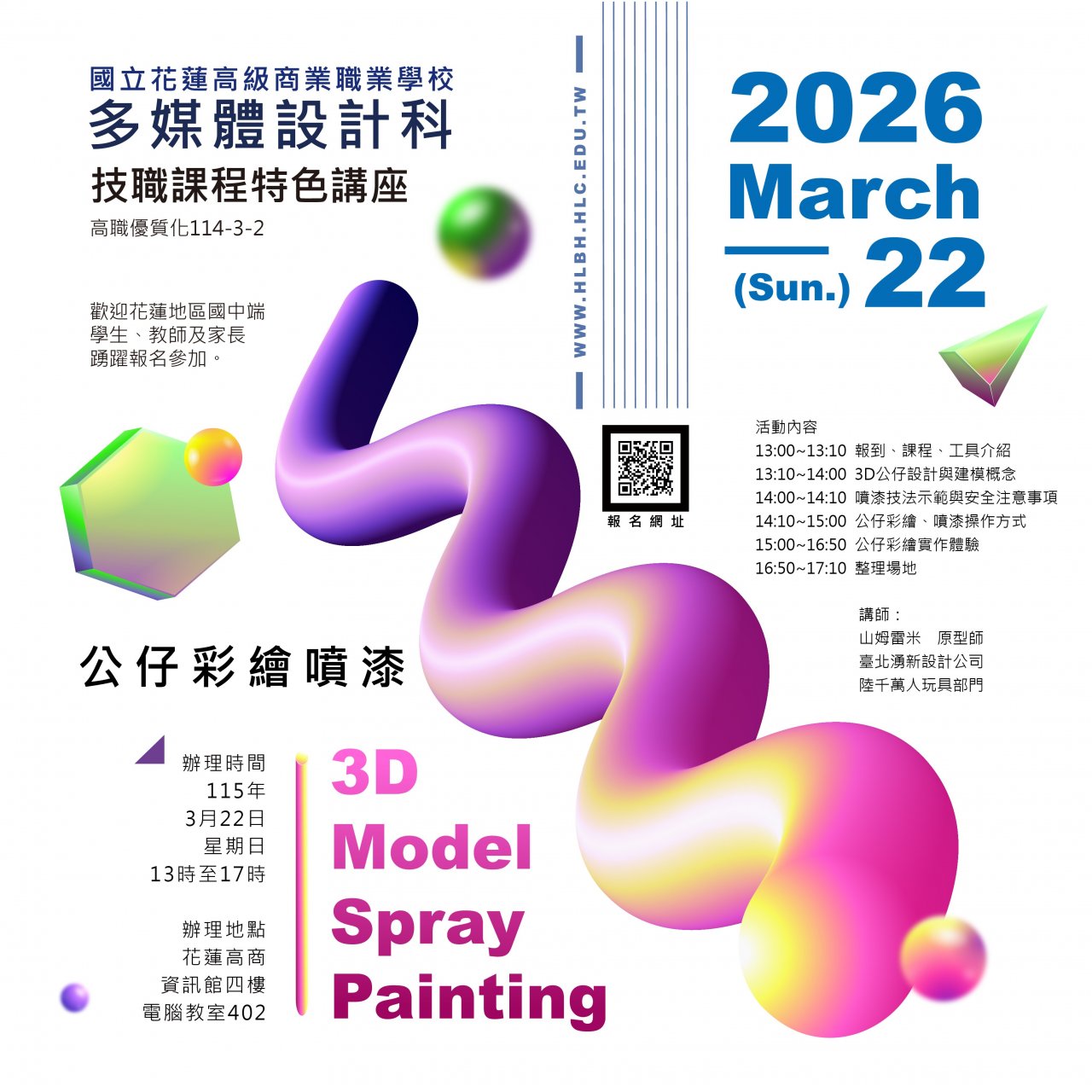 一、 增進花蓮區師生對技術型高中專業課程領域的認識,透過實作體驗課程:公仔彩繪噴漆,提升對 3D 建模之興趣。