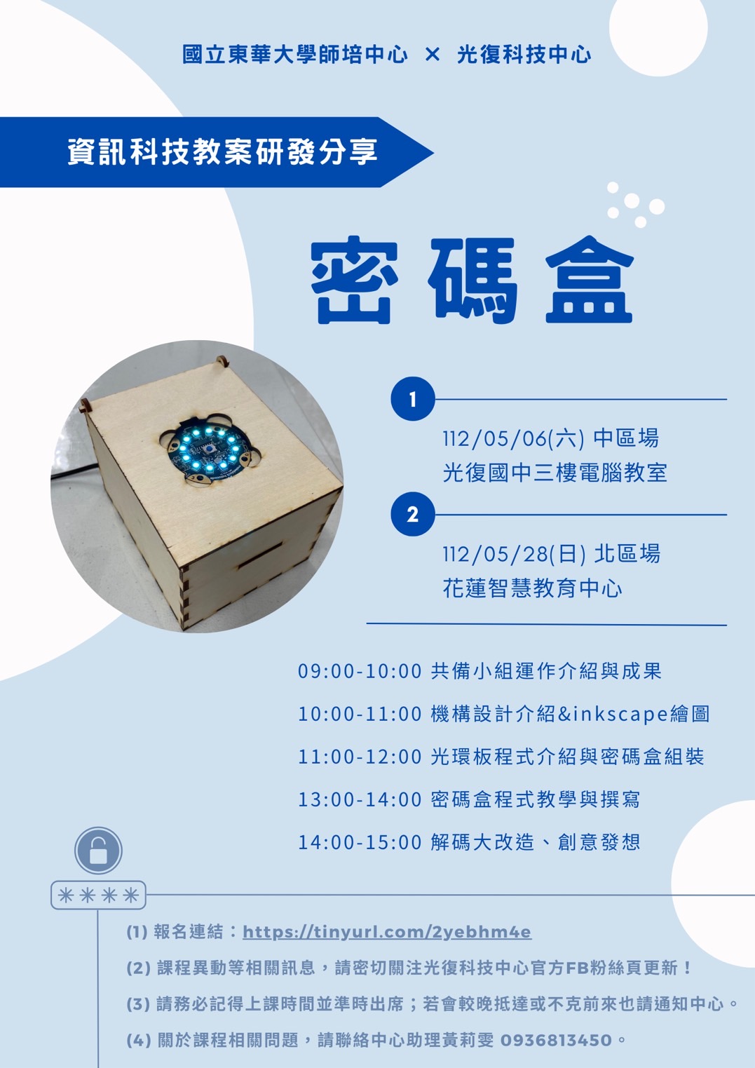 | 一、 | 為推動本縣科技教育並培訓相關教師,本校劉明洲教授、師培中心與光復科技中心共同成立課程共備小組,並規劃辦理「資訊科技教案研發分享:密碼盒」兩場教師研習,資訊如下: |