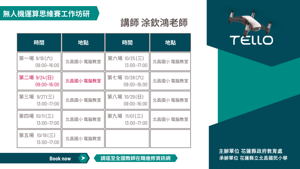 二、 為配合「2023 花蓮縣華紙公益盃全國無人機運算思維大賽」特辦理 9 場共訓研習課程,以期本縣選手熟悉競賽相關規定,穩定選手參賽當日狀況,課程資訊如下: