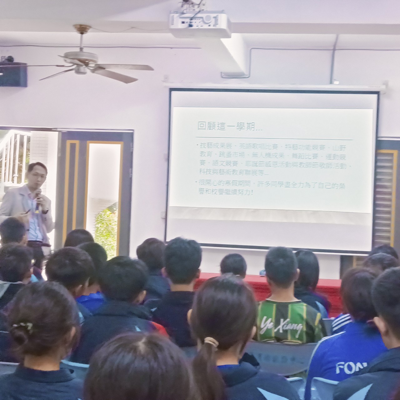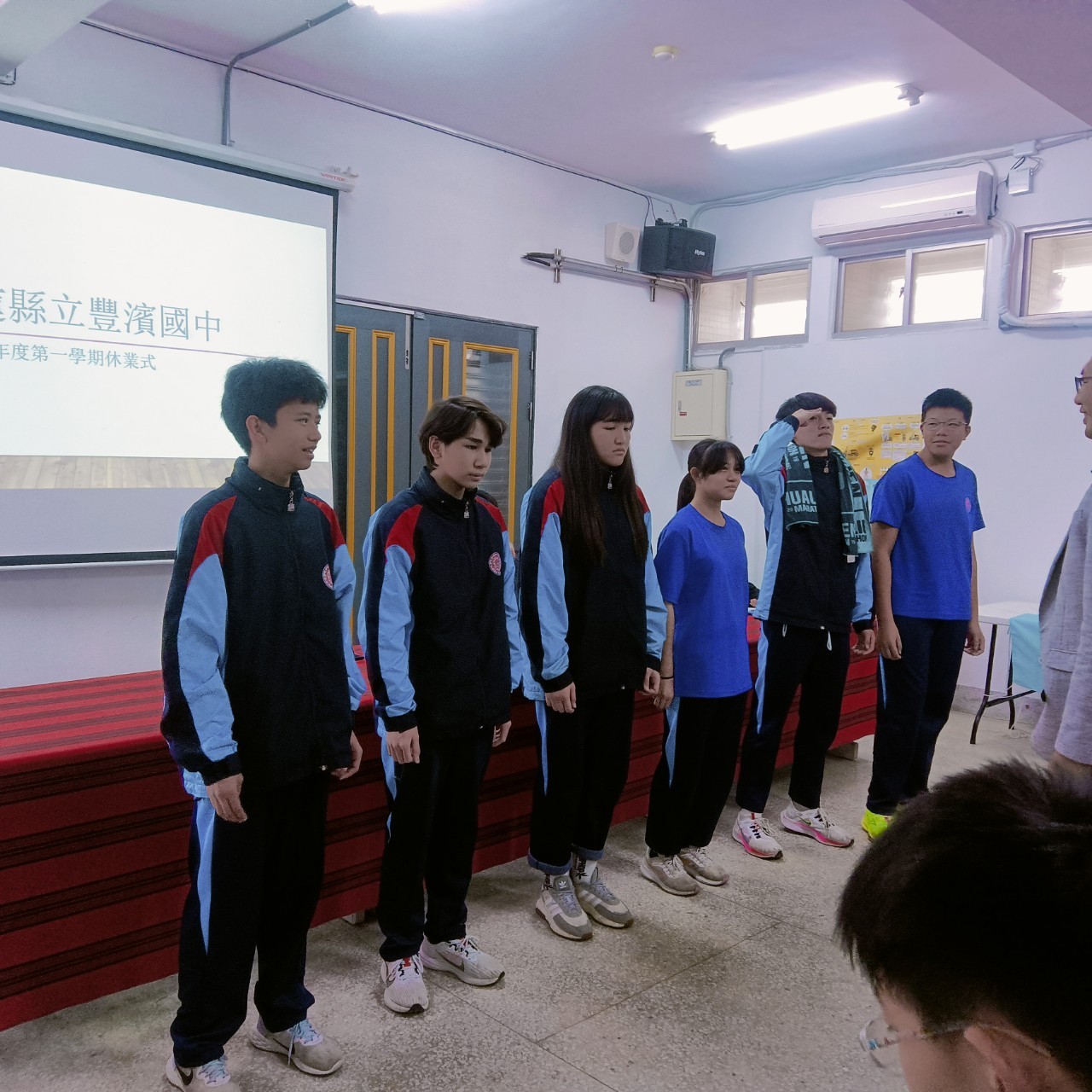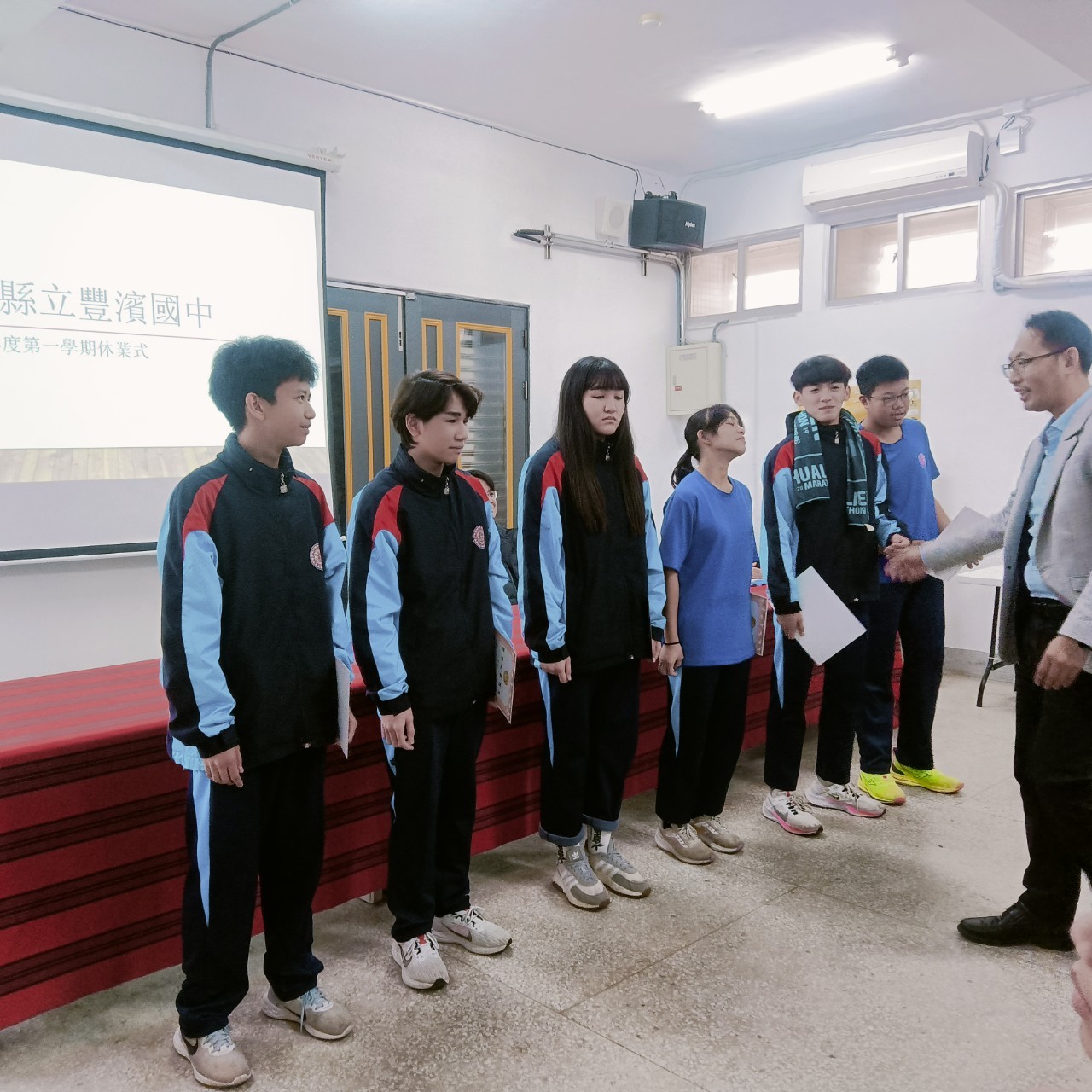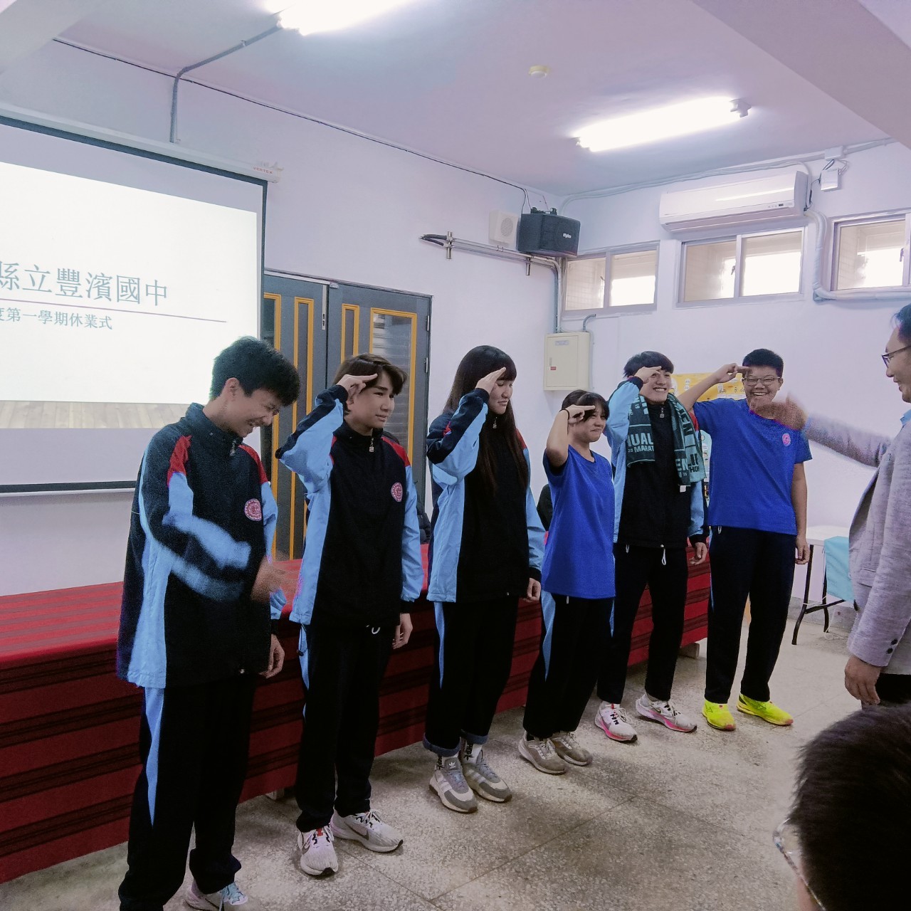 1/19豐中舉行期末結業式,各處室頒發各項獎項獎勵在學業、體適能方面表現優異學生,校長施宜廷在會中回顧這學期學生各項優異表現,更以北一女學生筆記小故事期勉學生能看見比自己更優秀學生都這麼努力,更要為自己的未來奮鬥。也祝福所有豐中人新年快樂。