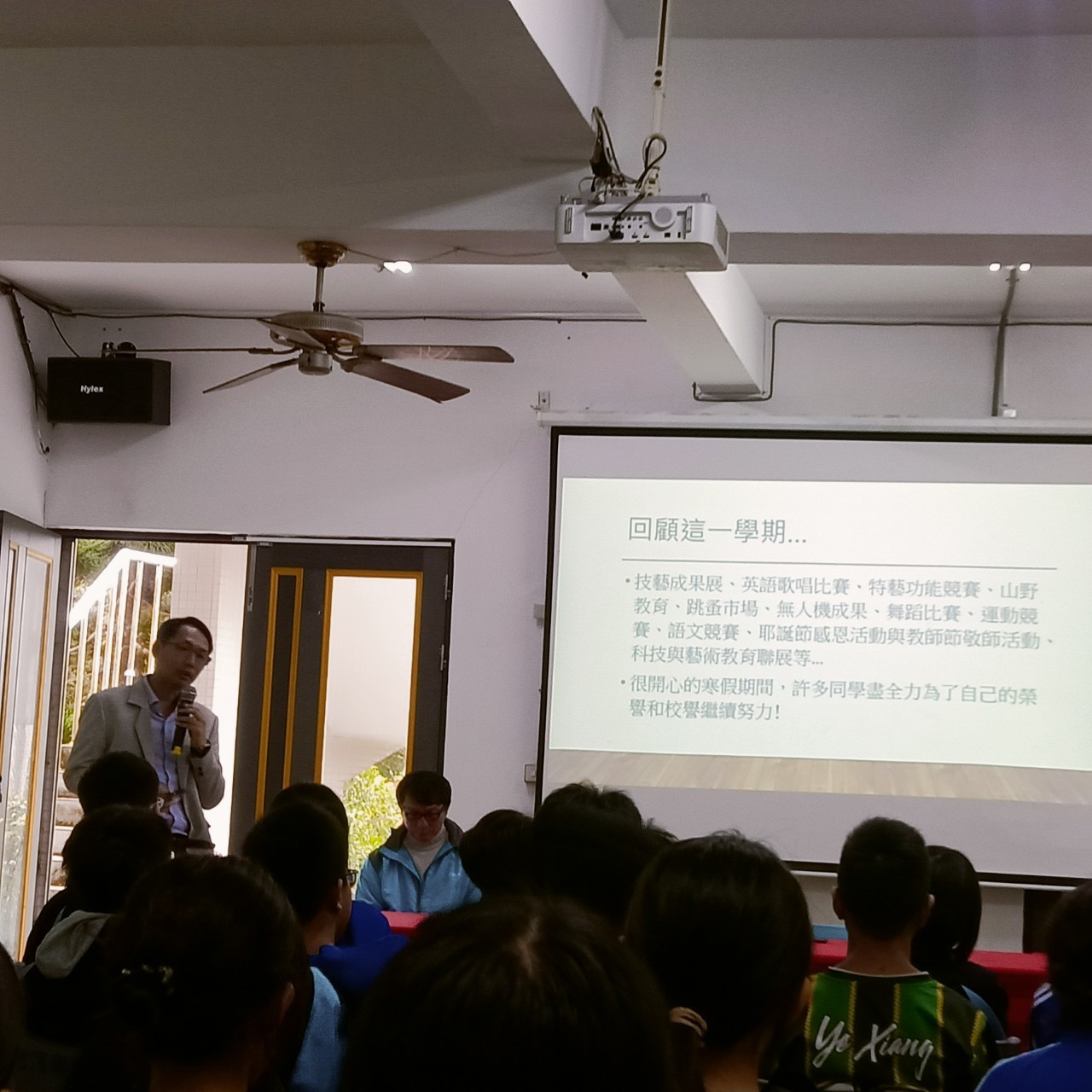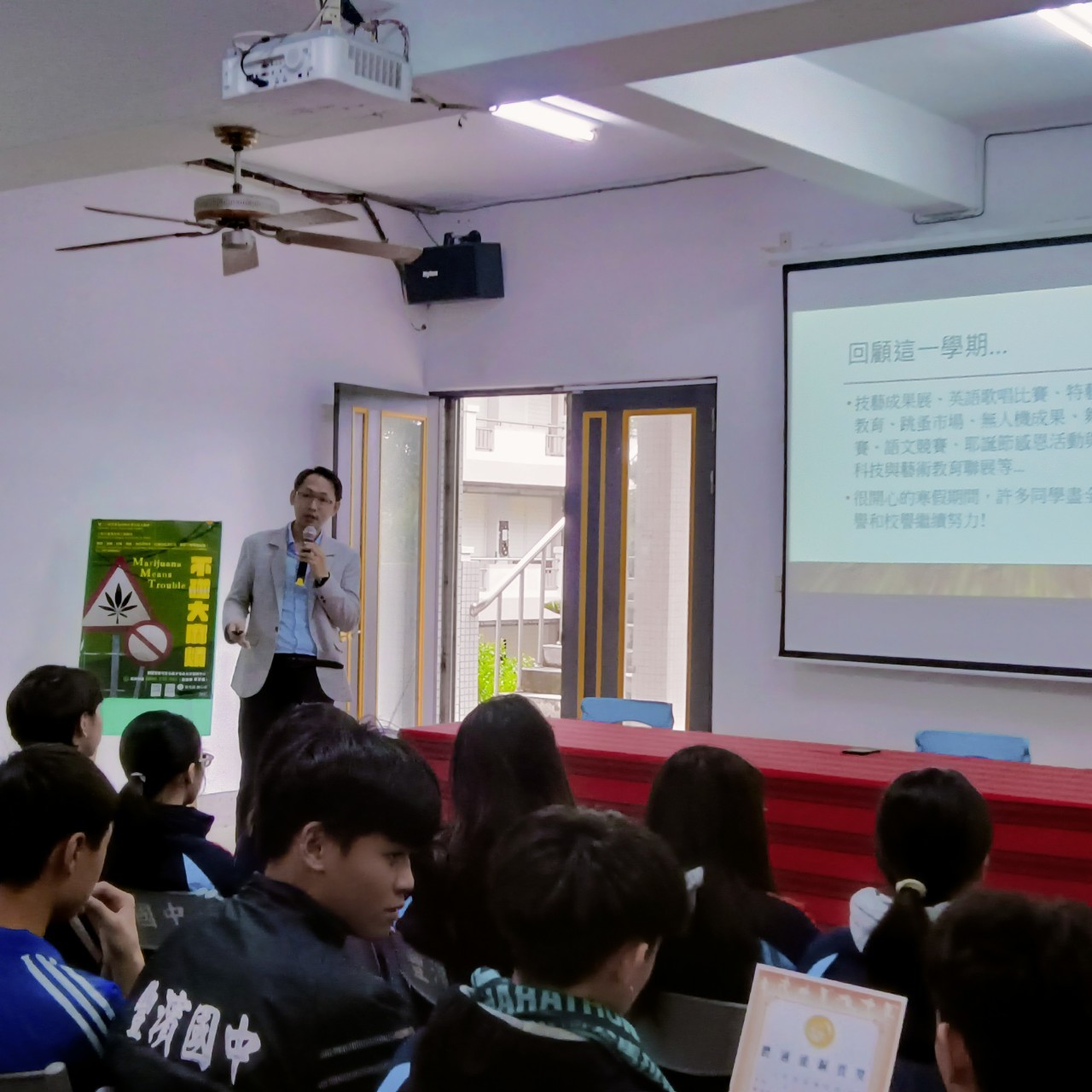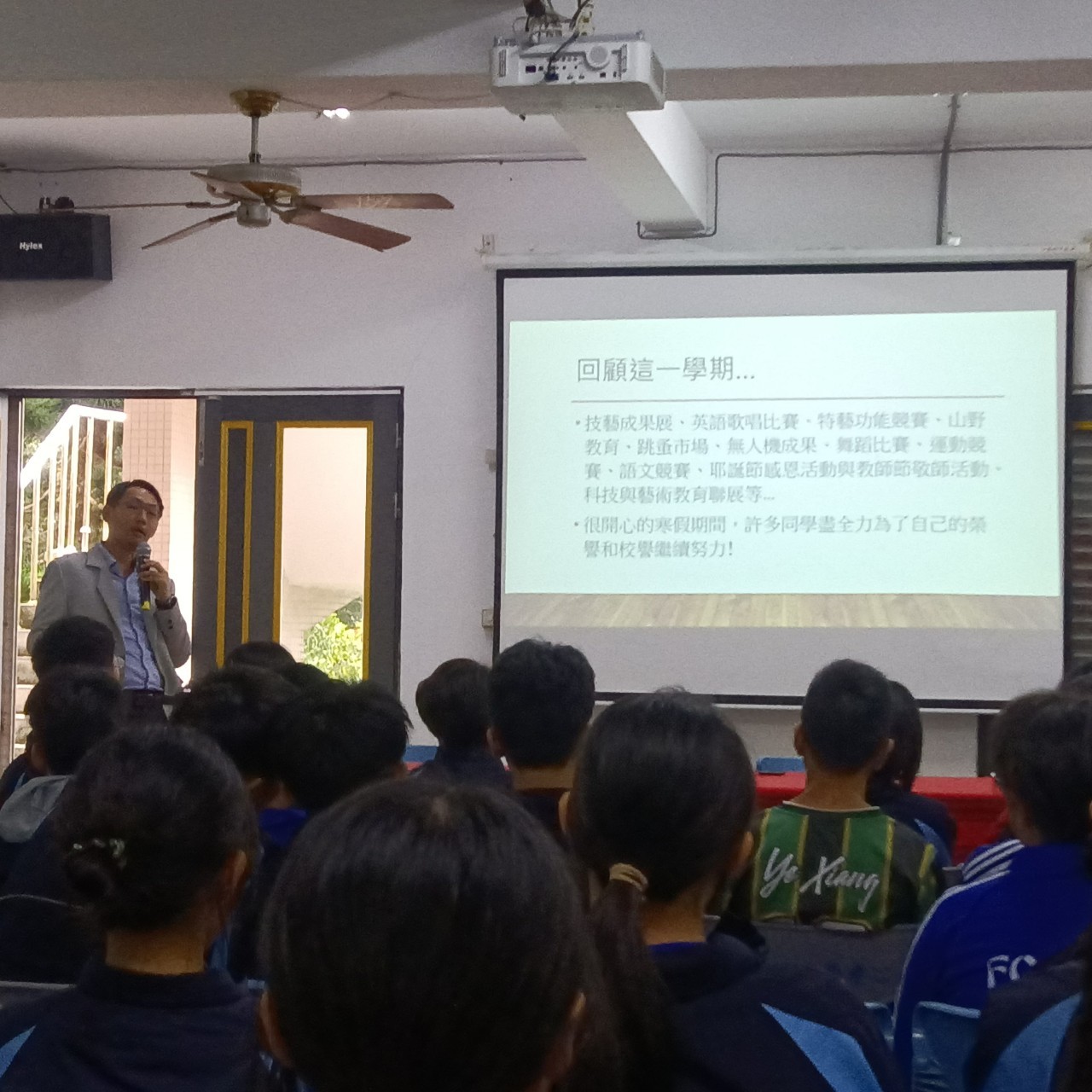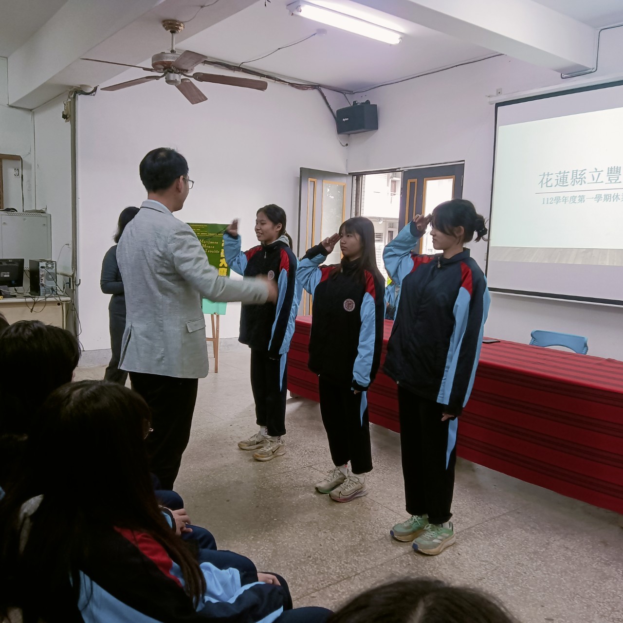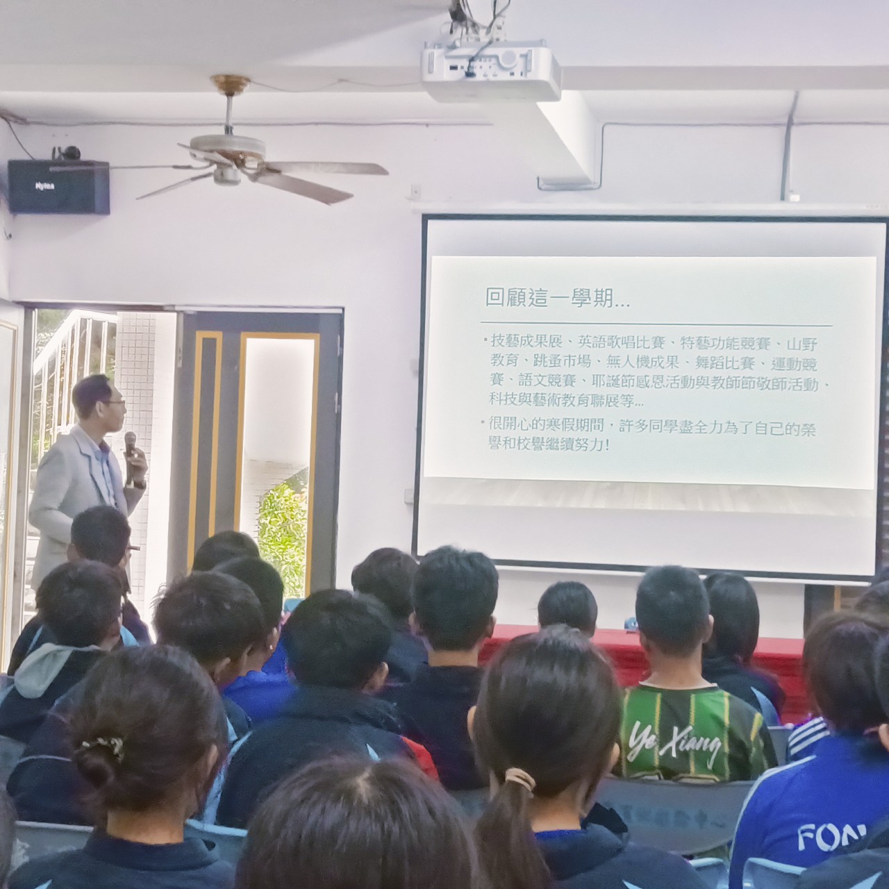 1/19豐中舉行期末結業式,各處室頒發各項獎項獎勵在學業、體適能方面表現優異學生,校長施宜廷在會中回顧這學期學生各項優異表現,更以北一女學生筆記小故事期勉學生能看見比自己更優秀學生都這麼努力,更要為自己的未來奮鬥。也祝福所有豐中人新年快樂。