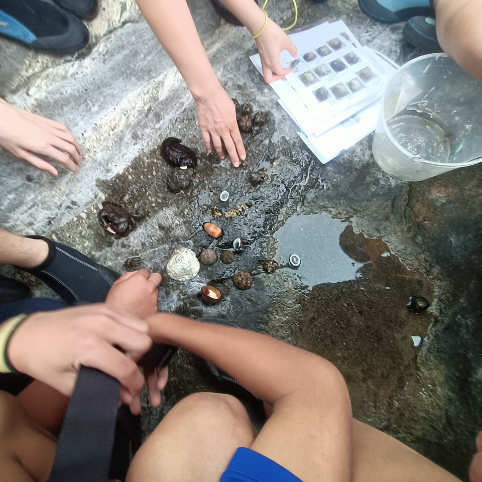 第二次活動,Candy老師在岸邊先讓同學認識潮間帶的功能、監測如何執行,如拉監測線、分組觀察、監測範圍、觀察技巧、拍照取景還有物種分類及辨識等等,感謝在石梯港執行監測教練,帶來的他們採集的物種,讓同學們有實際認識及比對圖鑑。