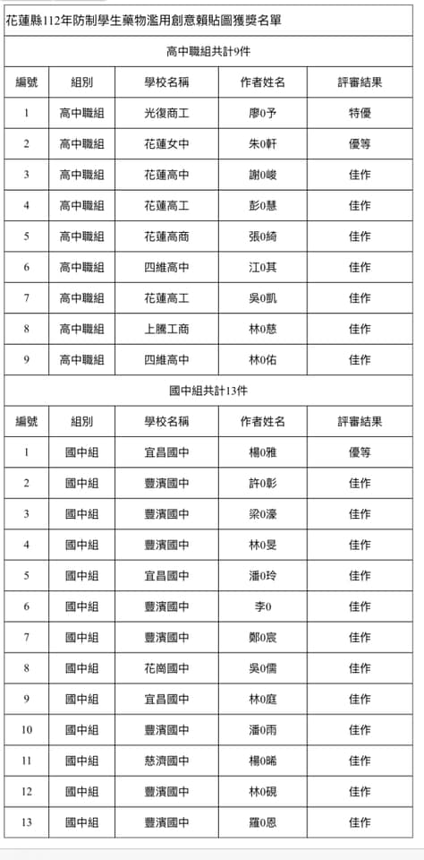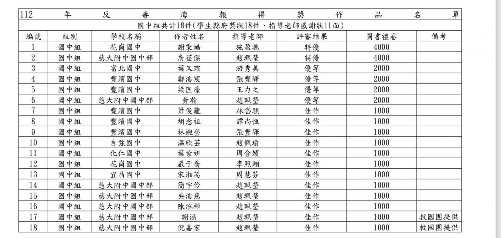 112年防制學生藥物濫用創意賴貼圖比賽及反毒海報比賽榮獲佳績