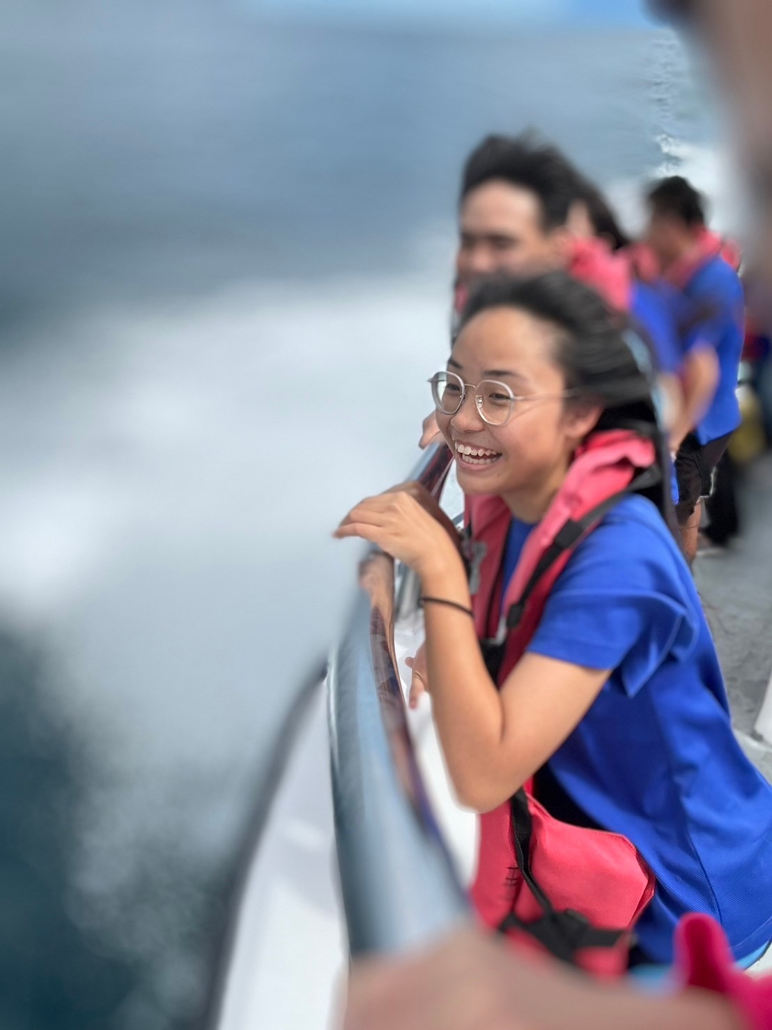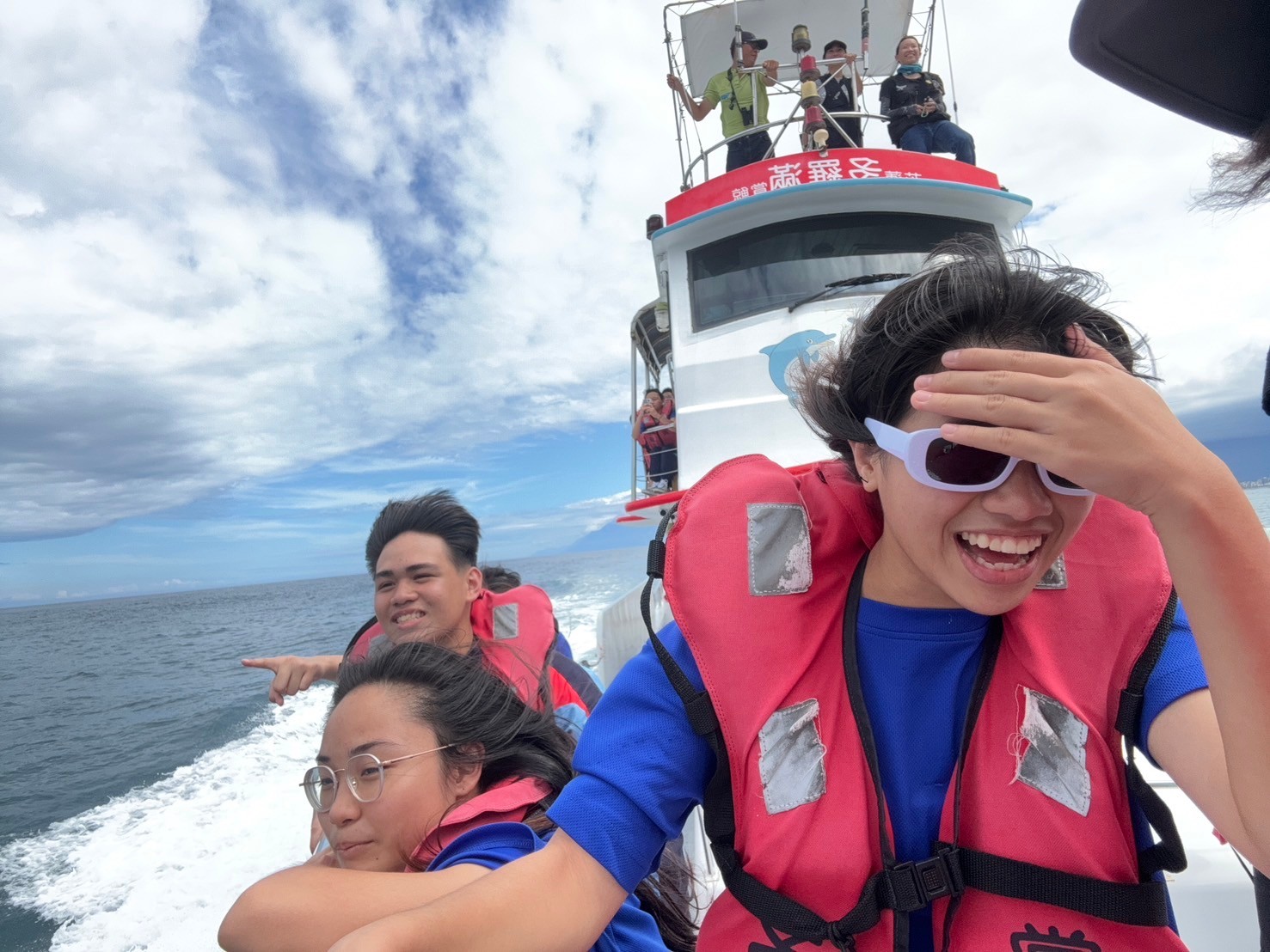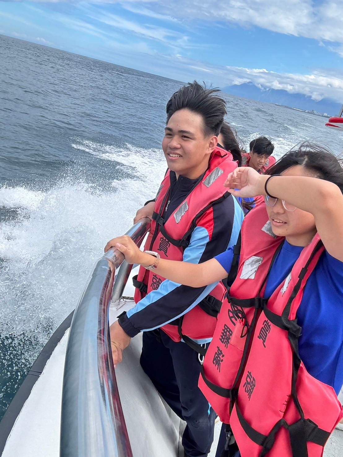 除了海豚之外,飛魚可以在海上飛行的時間比我們想像的還要久,聽說飛魚可以在海面飛行600公尺不落下。此外、零星的海鳥、太平洋的廣闊與中央山脈及海岸山脈的壯麗,更是讓我們打開另一種敬畏的視野,0403的地震在中央山脈劃下了刻痕,我們的大地受傷了,祈願今天的海洋之行,可以讓我們謙卑地面對我們賴以為生的大自然,生活中可以多做些有益於環境保護的事。