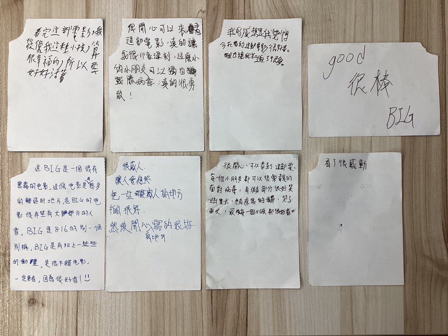 「看了很感動!」、「good 。很棒。BIG。」、「我的感想是我覺得今天看的這部電影很好看。而且也讓我知道了很多。」、「很感人!讓人會想哭,把一些感人的地方拍得很好!然後開心的地方寫得很好!」、「看完這部電影,我發現我這種小孩算很幸福的,所以要好好活著!」、「很開心可以來看這部電影,真的讓我很印象深刻,這麼小的小朋友可以獨自戰勝癌症,真的很勇敢!」、「很開心!可以看到這部電影!每一個小朋友都可以很樂觀的面對癌症,有很多部分很好笑、幽默、也有感傷的情節,哭了兩次!最後每一個小孩都很好看。」、「這BIG是一個很有意義的电影。這個電影是有很多難過的地方,這BIG的電影很希望有大部分的人看,BIG是816的一個別稱,BIG是有加上一些些的動畫,是很不錯电影,一定要看,因為很好看!」。