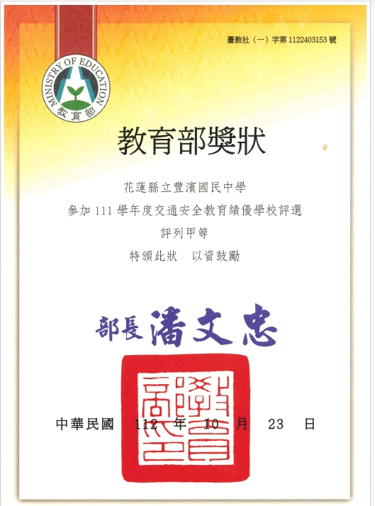 本校參加111學年度交通安全教育績優學校評選獲全國甲等!!