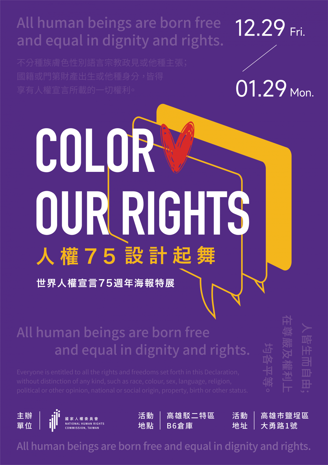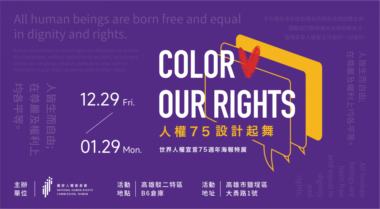 | 一、 | 2023年正值《世界人權宣言》75周年,本會於2023年舉辦「人權75 設計起舞」人權海報徵件競賽,期待通過藝術的力量,喚起公眾對於人權議題的關注。為使《宣言》的精神,持續在臺灣傳遞,特從915幀參賽作品中,擇選出85幀作品及特別展件「戰後臺灣第一幀人權海報」,象徵人權火炬世代的傳遞,邀請各界一同關注人權議題,爰策辦旨揭特展。 |