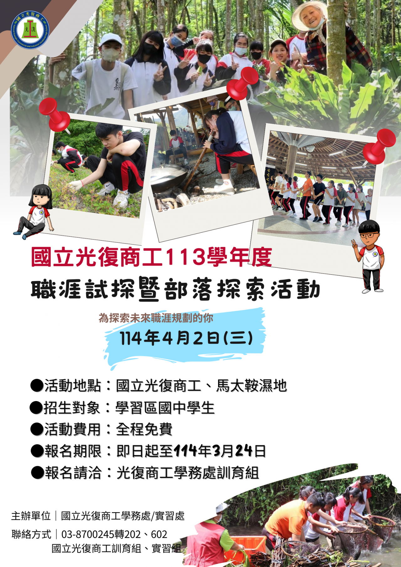 | 主旨: | 114年4月2日(星期三)假於本校舉辦113學年度職涯試探暨部落探索活動,敬邀 貴校學生參加,隨函檢附本校113學年度職涯試探暨部落探索活動計畫、活動海報、報名表及家長同意書,敬請協助公告,以利學生適性學習、適才發展。 |