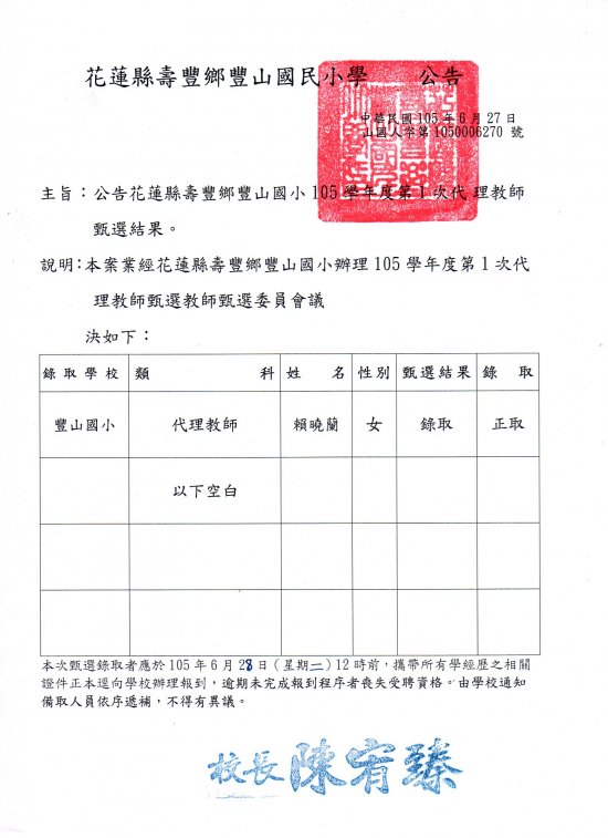 公告花蓮縣壽豐鄉豐山國小105學年度第1次代理教師 甄選結果