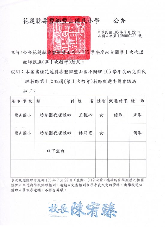 公告花蓮縣壽豐鄉豐山國小105學年度幼兒園第1次代理教師甄選(第1次招考)結果