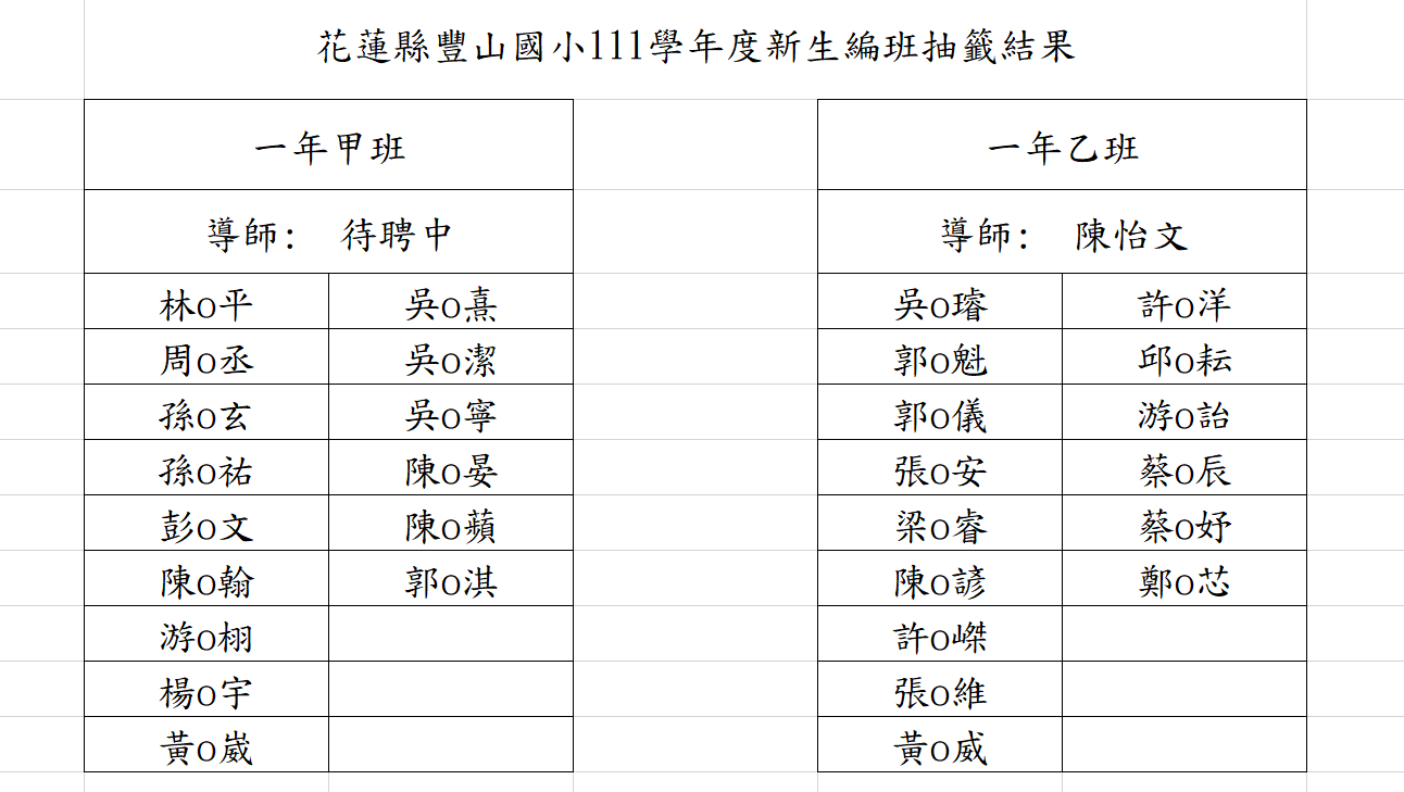 花蓮縣豐山國小111學年度新生編班抽籤結果
