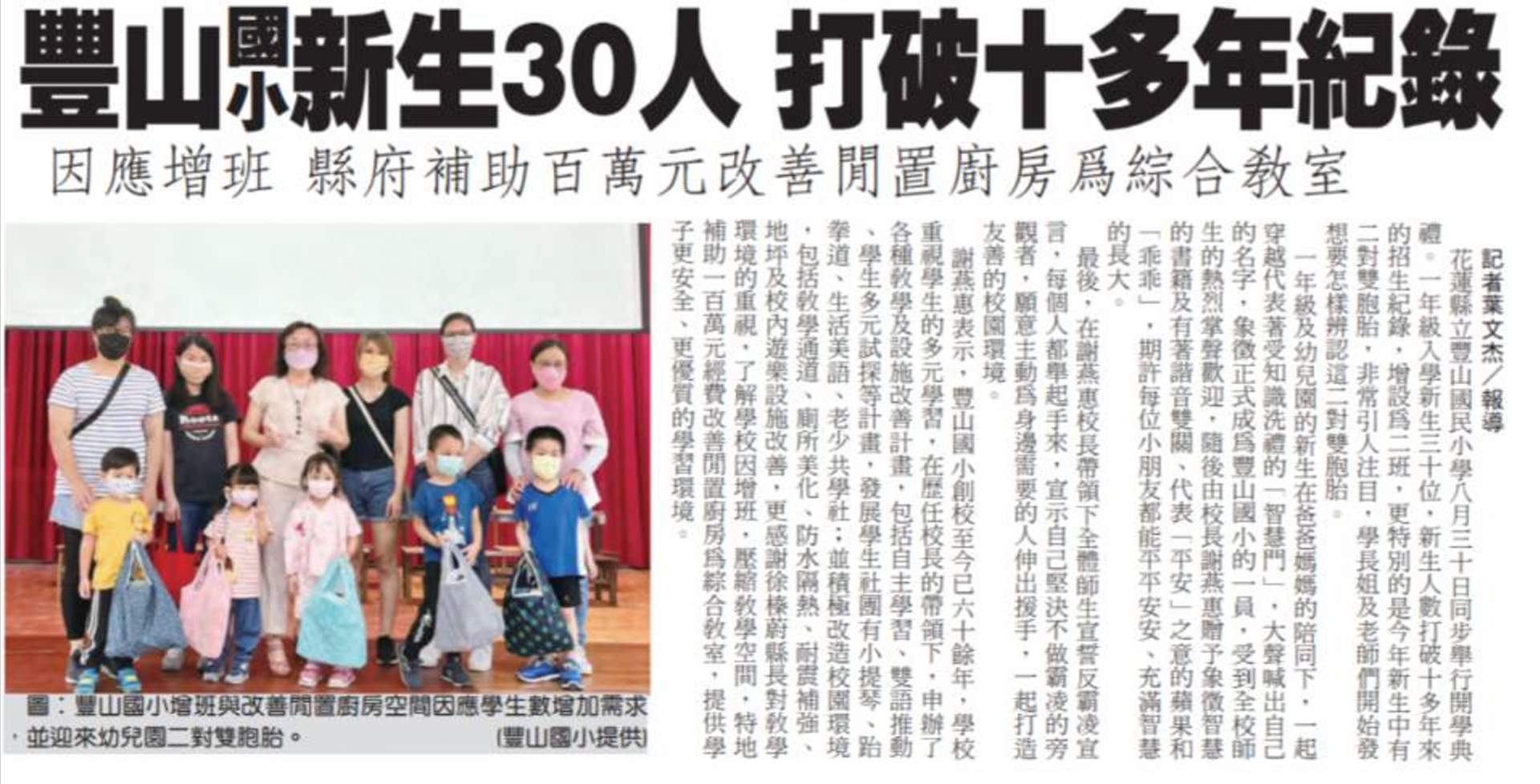 豐山國小新生30人,打破10多年紀錄--更生日報