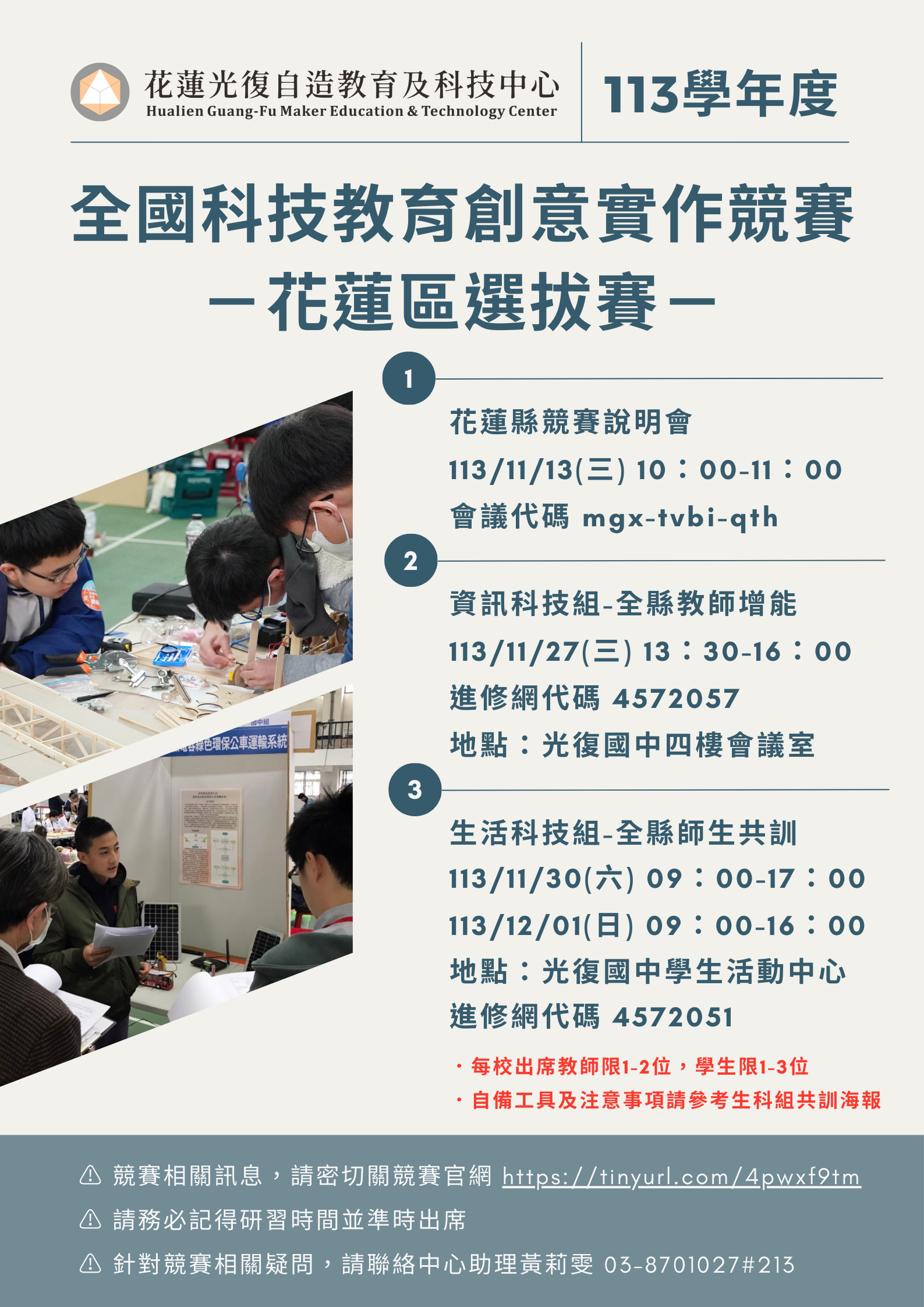 | 主旨: | 本縣辦理113學年度全國科技教育創意實作競賽_ 花蓮區選拔賽,相關事項如說明,請查照。 |