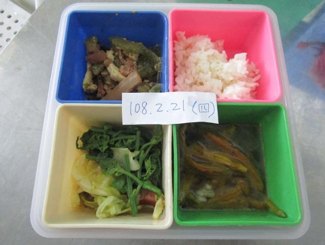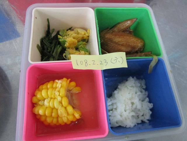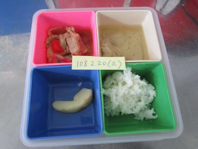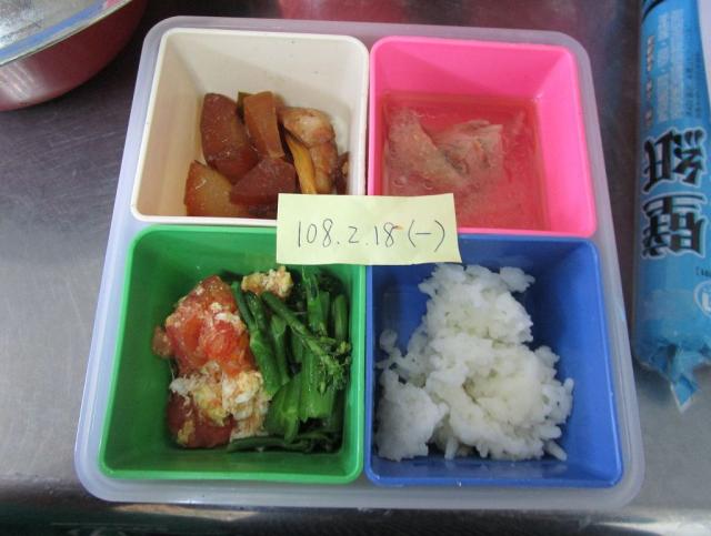 0218(一): 白飯、冬瓜紅燒肉、番茄炒蛋、青菜、雙菇雞湯 0219(二) 白飯、壽喜肉片、九層塔蛋、青菜、黃瓜排骨湯 0220(三) 豬肉燴飯、蘿蔔雞湯、時令水果(蘋果) 0221(四) 白飯、黃瓜燴三鮮、培根高麗菜、青菜、金針大骨湯 0222(五) 白飯、滷味什錦、三杯鮮菇、青菜、紫菜魚丸湯 0223(六) 白飯、滷雞翅、蔥蛋、青菜、玉米大骨湯 【備註: 配合3/1(五)調整放假;0223(六)彈性補課。】
