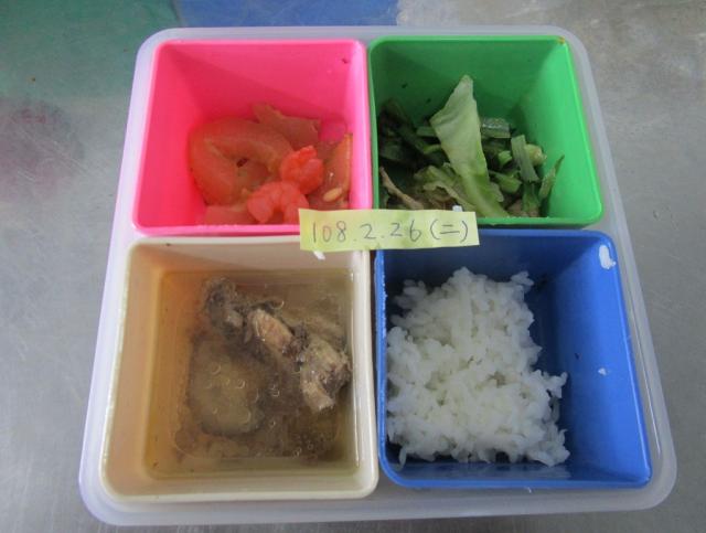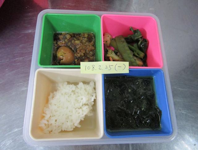 0225(一):白飯、鵪鶉蛋滷肉燥、鮮炒透抽、青菜、海帶芽排骨湯 0226(二)白飯、黃瓜燴三鮮、螞蟻上樹、青菜、香菇雞湯 0227(三) 什錦炒飯、蘿蔔貢丸湯、時令水果(柳丁) 【備註:228和平紀念日,2/28(四)~3/3(日)連假四天,提醒出入公共 場所戴口罩、勤洗手喔!】