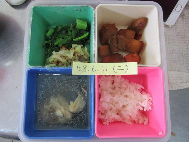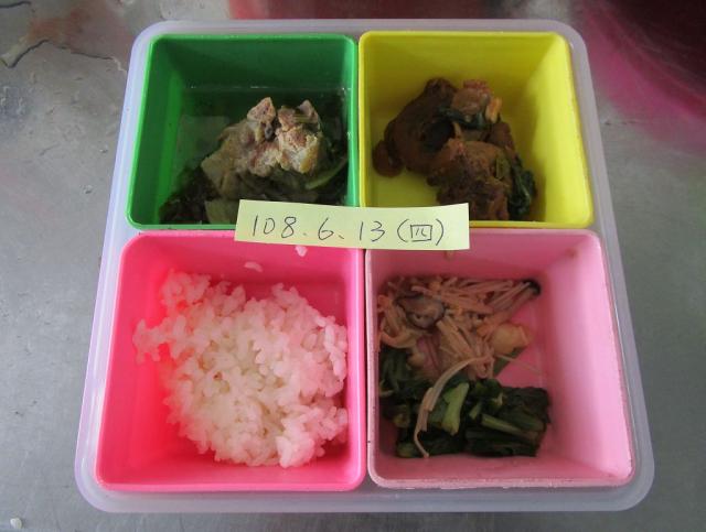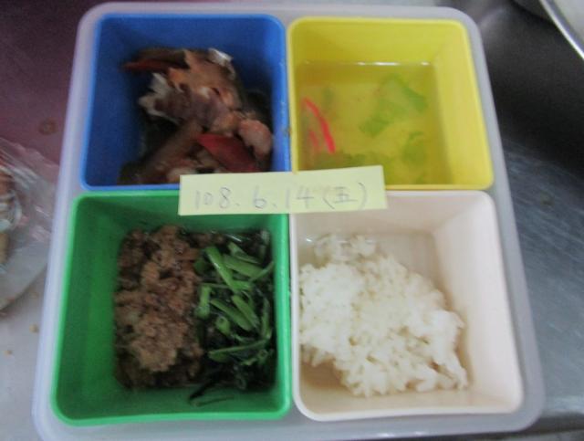 0610(一):白飯、鵪鶉蛋滷肉燥、鮮炒透抽、青菜、海帶芽排骨湯 0611(二):白飯、滷五花肉、螞蟻上樹、青菜、香菇雞湯 0612(三): 什錦炒飯、蘿蔔貢丸湯、時令水果(蘋果) 0613(四):白飯、三杯雞、蒜香鮮菇、青菜、酸菜排骨湯 0614(五):白飯、清蒸魚片、滷肉燥、青菜、魚板時蔬湯