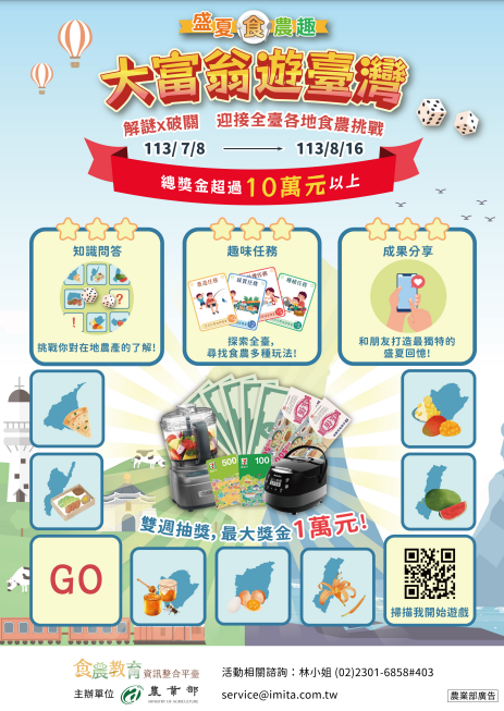 | 四、 | 為強化食農教育素養,並促使大眾更加瞭解食農教育,該部應用本平臺內容,訂於 113 年 7 月 8 日至 8 月 16 日舉辦「盛夏食農趣:大富翁遊臺灣」食農教育推廣活動(網址: https://fae.moa.gov.tw/2024event/ ),提供食農教育相關知識問答、任務體驗與成果分享等遊戲,參與活動即可抽獎,總獎金超過 10 萬元,歡迎踴躍參與。 |