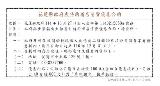 (1141119宣導)花蓮縣政府與步勞鬆養生館消費優惠合約
