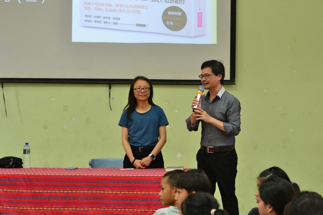 知名小說作家-陳郁如來到富源國小和小朋友分享創作的想法以及書中的有趣故事。