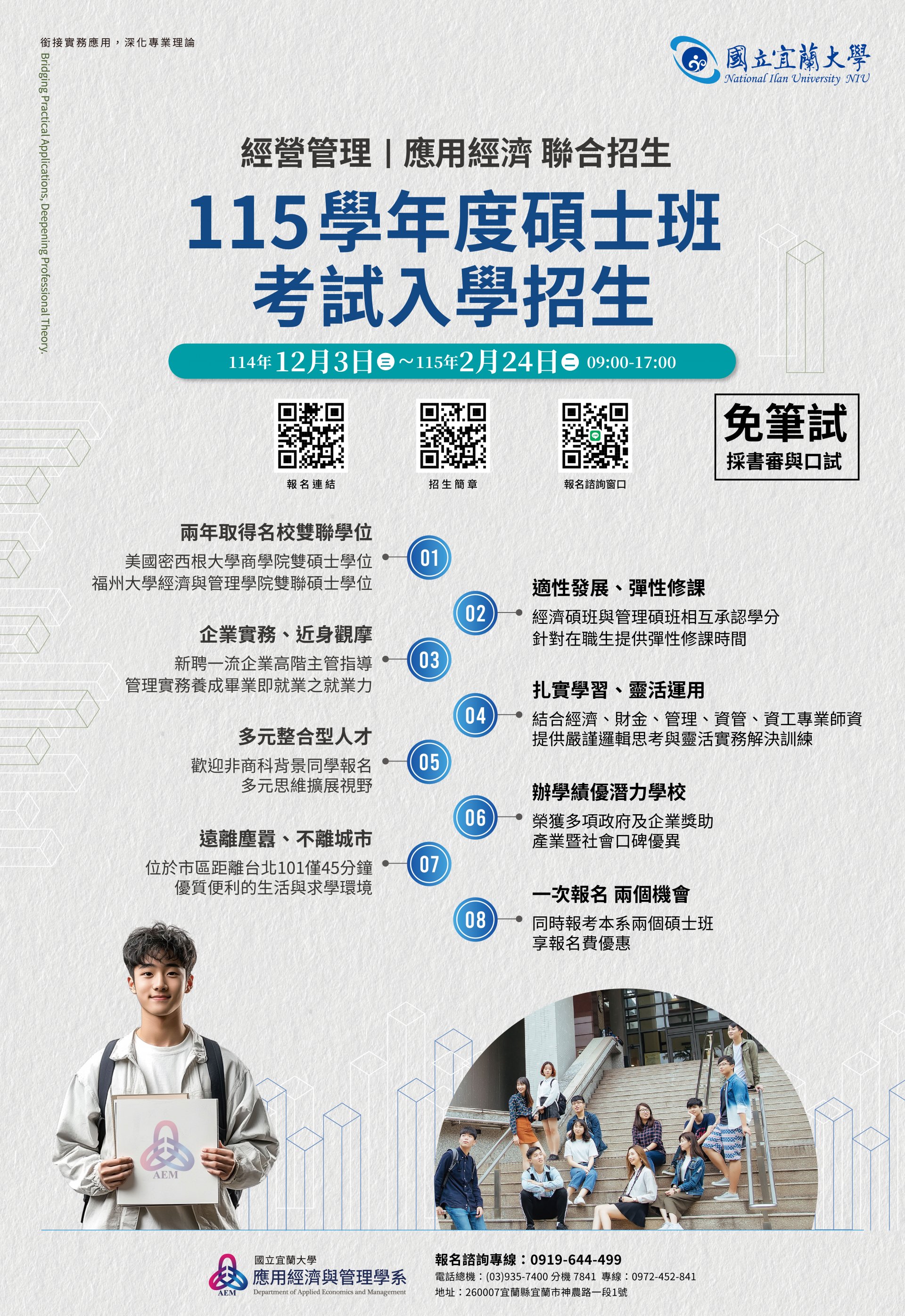 | 一、 | 為提供各級學校教職員多元且具實務導向之進修管道,本校應用經濟與管理學系設有研究所碩士班,包含「應用經濟學碩士班」及「經營管理碩士班」,特函請貴校協助公告相關招生資訊。 |