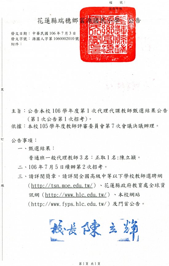 花蓮縣瑞穗鄉富源國民小學106學年度第1次公告代理、代課教師甄選結果公告(第1次招考)