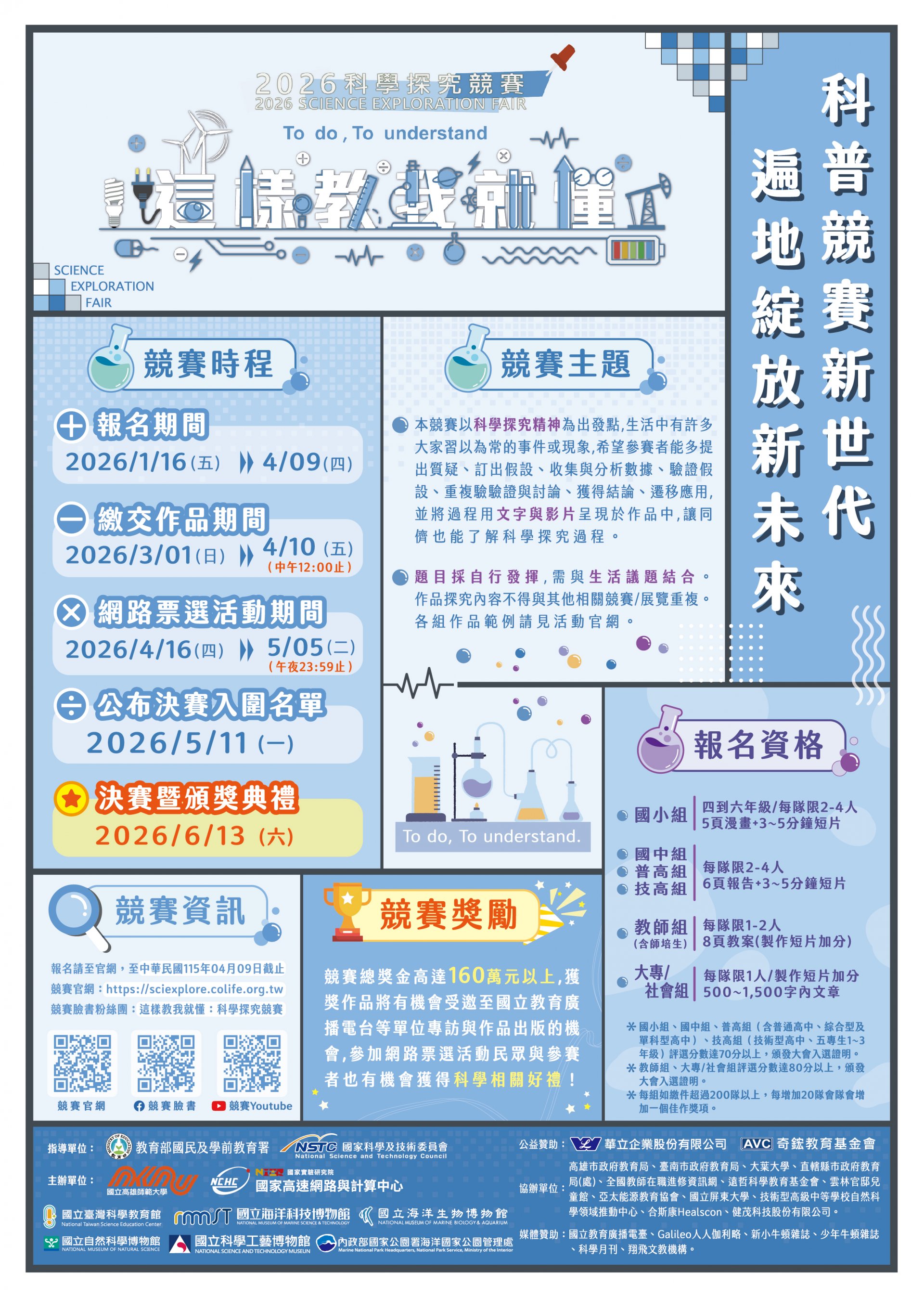 | 主旨: | 轉知國立高雄師範大學辦理2026年「科學探究競賽-這樣教我就懂」相關資訊,歡迎貴校師生踴躍參加,請查照。 |